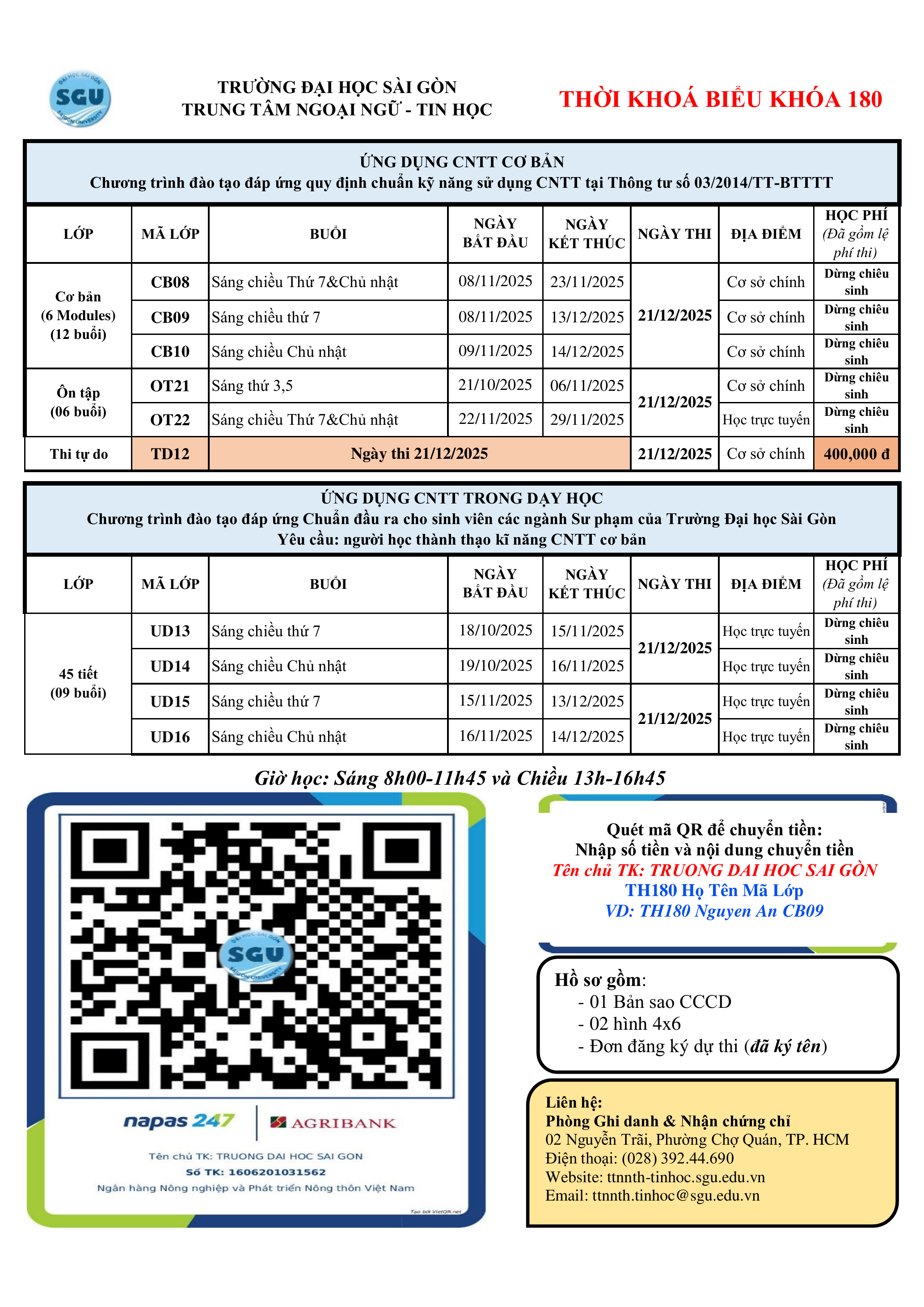 4. Thời hạn phúc khảo (chỉ áp dụng cho điểm thực hành Ứng dụng CNTT Cơ bản): Sau khi công bố điểm đến 13 giờ 30 ngày 06/11/2025 (sau thời gian này Trung tâm không giải quyết). Thí sinh phúc khảo điểm thi liên hệ phòng Ghi danh.