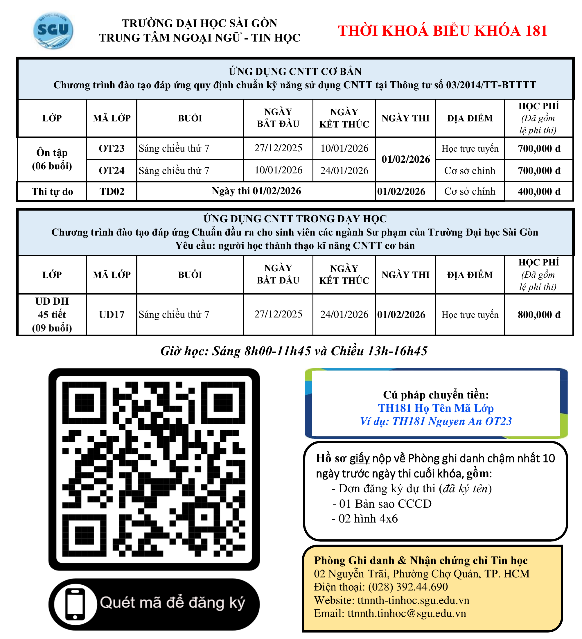 Trung tâm Ngoại ngữ – Tin học nhận đăng ký khóa 181, ngày thi 01/02/2026.