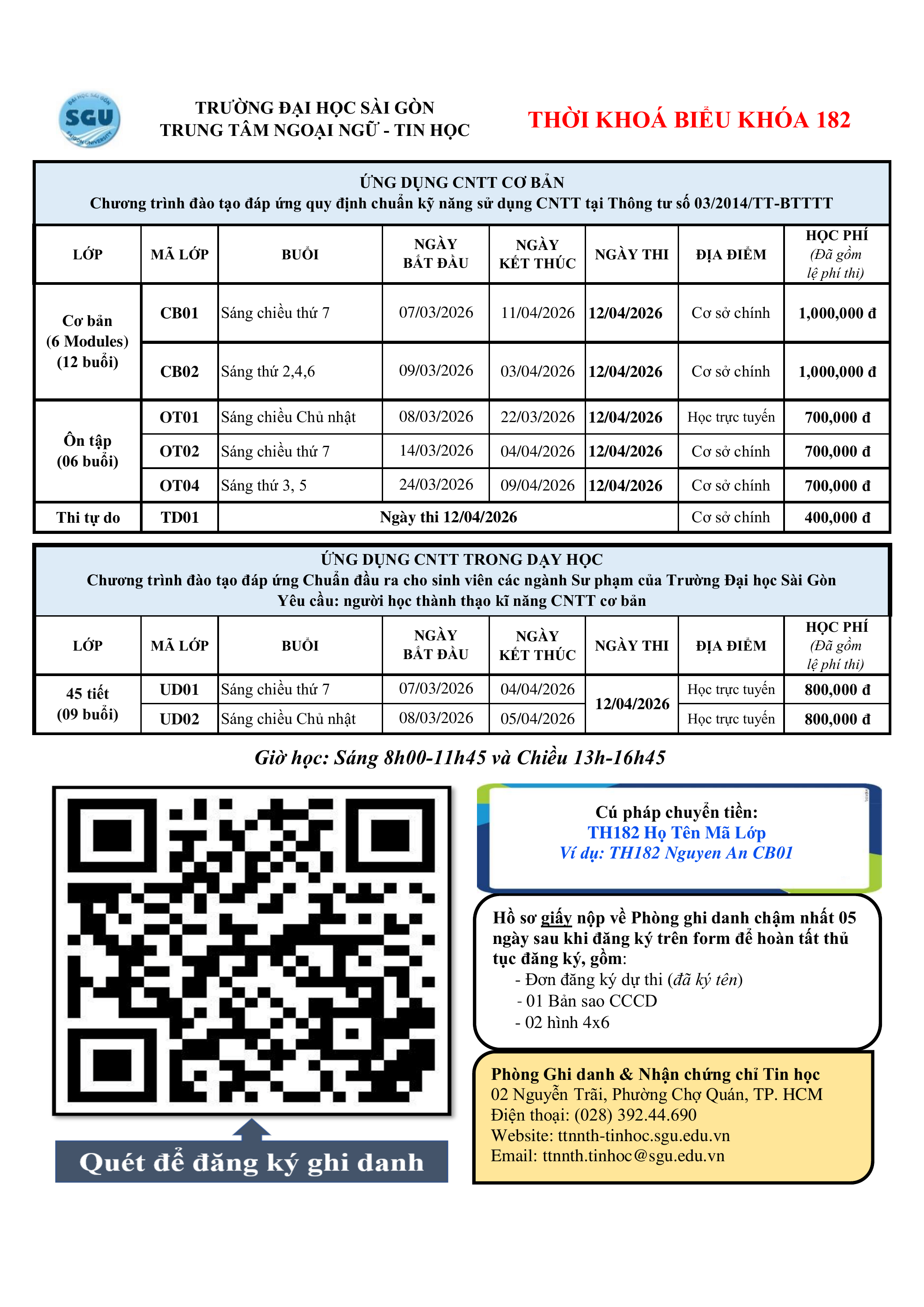 Trung tâm Ngoại ngữ – Tin học nhận đăng ký khóa 182, ngày thi 12/04/2026.